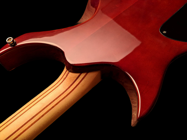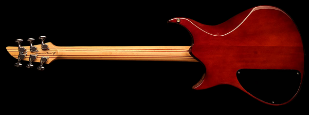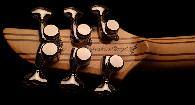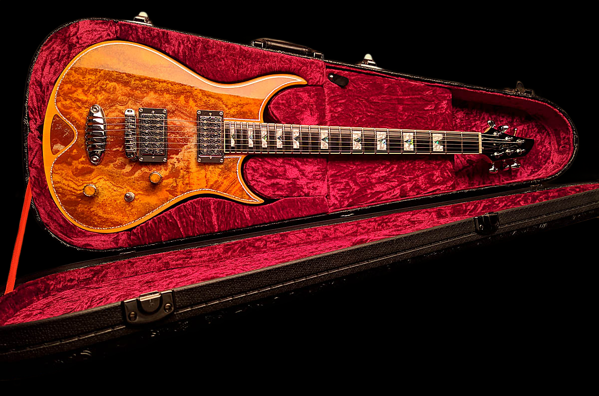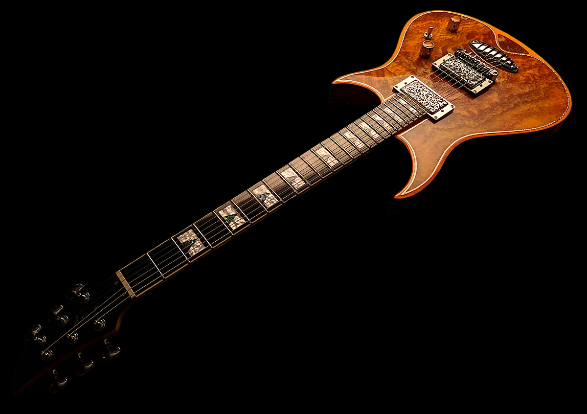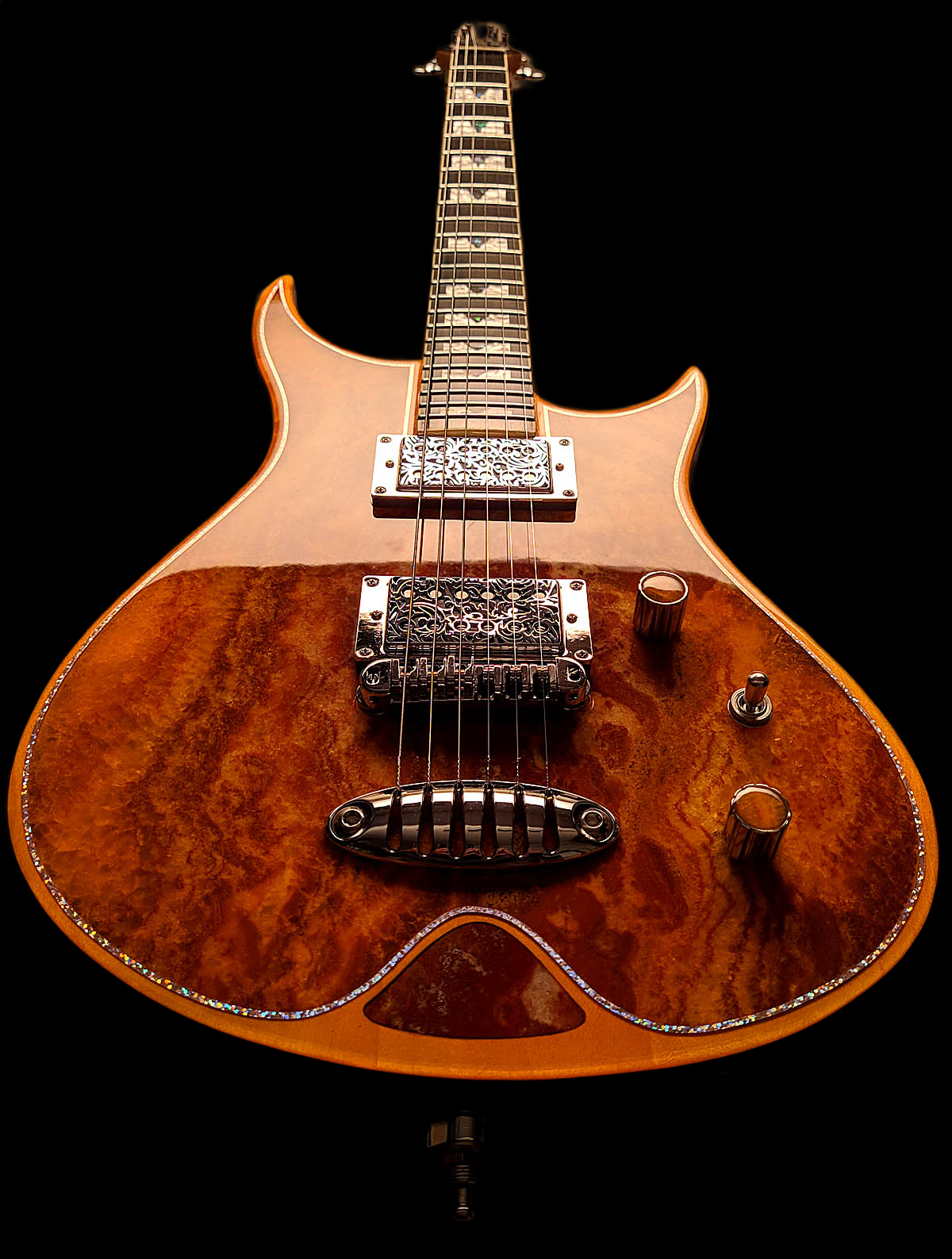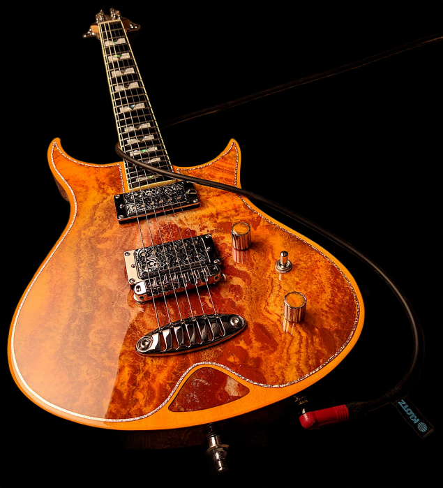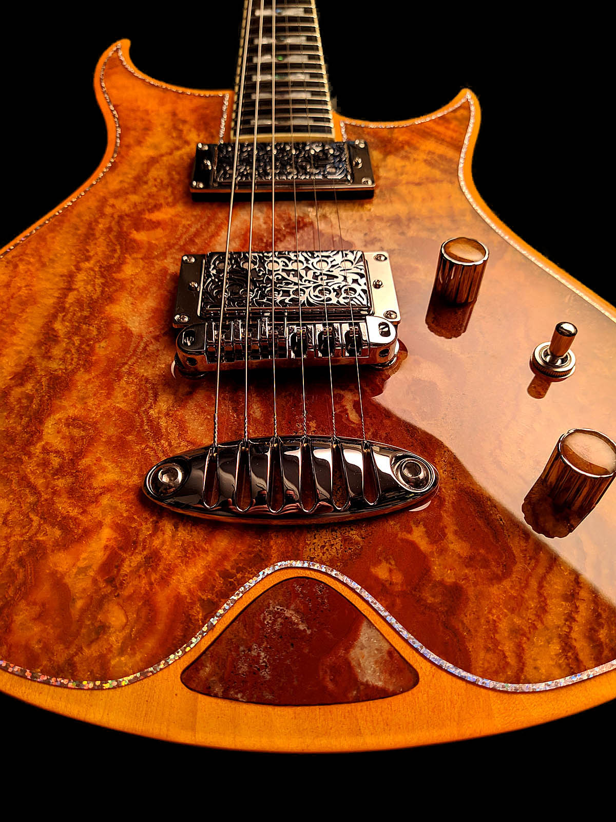 Gorgonized Morpheus #OF001 “George” – Stone, Sound & SoulMeet the first new Morpheus in over a year – and the very first with a set-neck design. More resonance, more sustain, and a fluid playing feel.The top? Not a print, not a veneer, not “stone-look” – but the real thing: a 5 mm slab of natural banded calcite (“Onyx Fantastico Red Light”), formed over millions of years. Finished in Orange Burst with a chrome hologram pinstripe.The chambered basswood body keeps the weight comfortable, while the stone adds clarity and sustain. Fiberglass backing makes the top impact-resistant and stage-ready.The three-piece Canadian maple neck (with mahogany stripes) is built for stability, topped with a 12" radius Ebonol fingerboard for smooth playability and bright tone.Electronics are pure versatility: Kammerstein Z2 humbuckers with coil-split for single-coil sparkle. Hardware includes a Wilkinson roller bridge, custom Lite-Speed Tailpiece, locking tuners, and a GraphTech nut for rock-solid tuning. Even the knobs feature calcite inlays to match the top.This guitar weighs just 3.6 kg, comes in a luxury hardshell case, and includes a certificate of authenticity. Named “George” in honor of a dear friend who inspired the Gorgonized series.SpecificationsModel: Gorgonized Morpheus #OF001 “George”Body: Chambered basswood with 5 mm natural calcite top (Onyx Fantastico Red Light)Top finish: Orange Burst with chrome hologram pinstripeTop backing: Fiberglass reinforcedNeck: 3-piece Canadian maple with mahogany stripes (set-neck)Scale length: 25.5" (648 mm)Neck profile: Modern CFingerboard: Ebonol, 12" radiusFrets: 22 medium jumboNut width: 43 mm (GraphTech)Pickups: Kammerstein Z2 humbuckers (coil-split)Controls: 3-way toggle, master volume, master tone (push/pull for coil split)Bridge: Wilkinson roller bridgeTailpiece: Custom Lite-Speed TailpieceTuners: Locking tunersHardware color: ChromeWeight: 3.6 kgCase: Luxury hardshell case includedExtras: Calcite inlay knobs, certificate of authenticity
